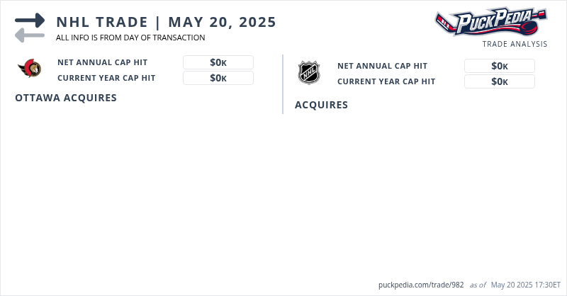The Ottawa Senators are forced to forfeit their 2026 first round pick. This is due to a penalty imposed by the NHL for a "botched deal" involving forward Evgenii Dadonov. The penalty stems from how the Senators handled Dadonov's no-trade clause in his trade to the Golden Knights. The Senators will needed to decide which year to forfeit the pick by 24 hours after the draft lottery for that year. They did not forfeit the 2024 or 2025 pick, therefore the 2026 pick will be forfeited. It is possible that the NHL amends the penalty and returns the pick to Ottawa, but so far no change to the originally announced penalty has been shared publicly.