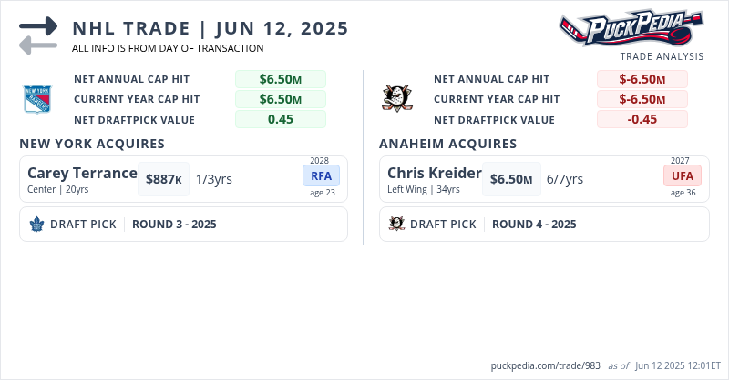 The Anaheim Ducks acquired Chris Kreider and a 2025 4th round pick from the New York Rangers for Carey Terrance and a 2025 3rd round pick