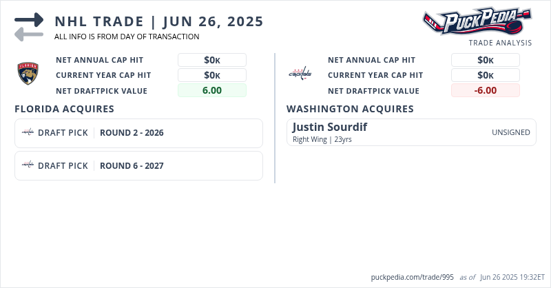 The Washington Capitals acquired Justin Sourdif from the Florida Panthers for 2026 2nd Round Pick & 2027 6th Round Pick
